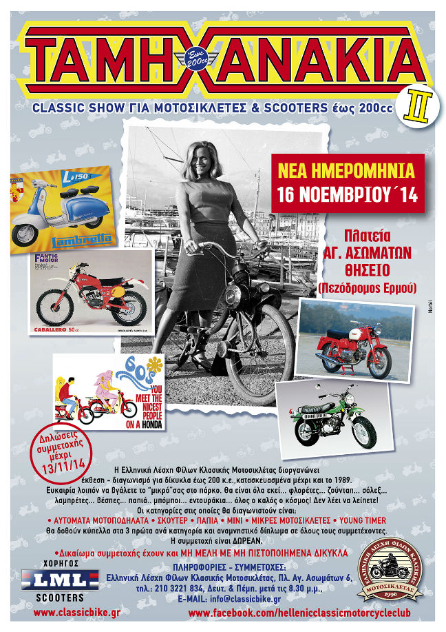 Η εκδήλωση «Τα Μηχανάκια ΙΙ», αφιερωμένη στα κλασικά δίκυκλα μικρού κυβισμού έγινε την Κυριακή 16/11/2014 στο Θησείο, με μεγάλη επιτυχία από την Ελληνική Λέσχη Φίλων Κλασσικής Μοτοσυκλέτας.