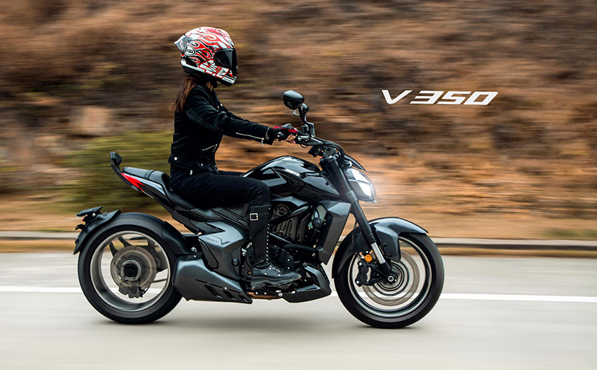 Το πολύ όμορφης σχεδίασης ψαλίδι συνδυάζεται και με ένα φαρδύ πίσω ελαστικό διάστασης 180/55-17, που τονίζει τον power cruiser χαρακτήρα της V350.