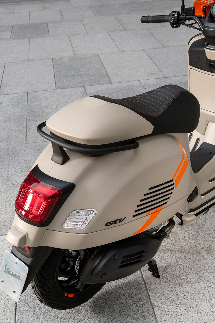 Η νέα Vespa Gtv είναι διαθέσιμη σε δύο αποχρώσεις, μπεζ ματ “Beige Avvolgente Opaco” και μαύρο γυαλιστερό “Nero Convinto”, με πορτοκαλί γραφικά στην μπροστινή μάσκα και τα πλαϊνά.