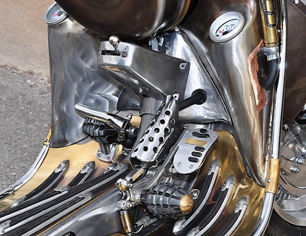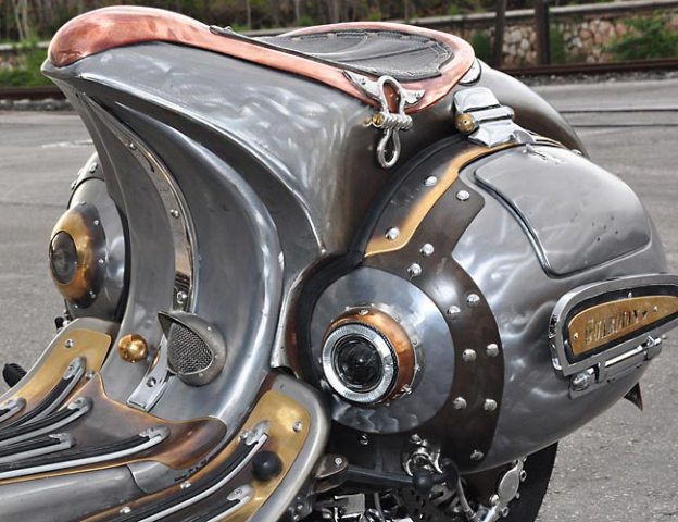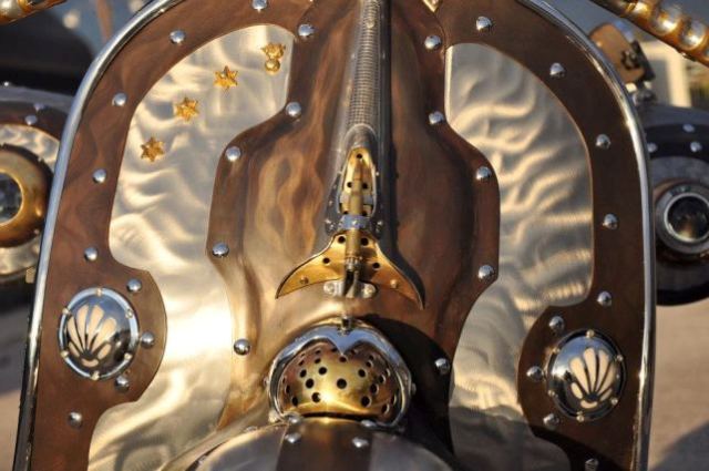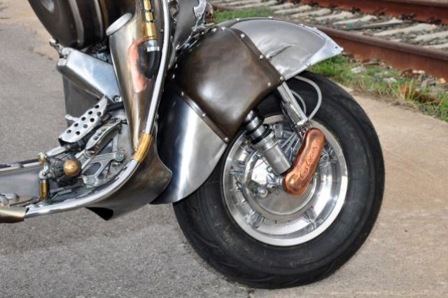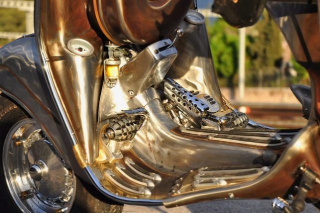 Δεν υπάρχει ίσως ούτε τετραγωνικό εκατοστό του «μεταλλικού» αμαξώματος που δεν έχει αλλαχτεί. Κι όμως! Κανείς δεν θα αμφέβαλλε ούτε στιγμή πως κάτι τέτοιο θα σχεδίαζε ο πατέρας των Βέσπα Corradino D’Ascanio, αν ζούσε σε ένα Steampunk σύμπαν.