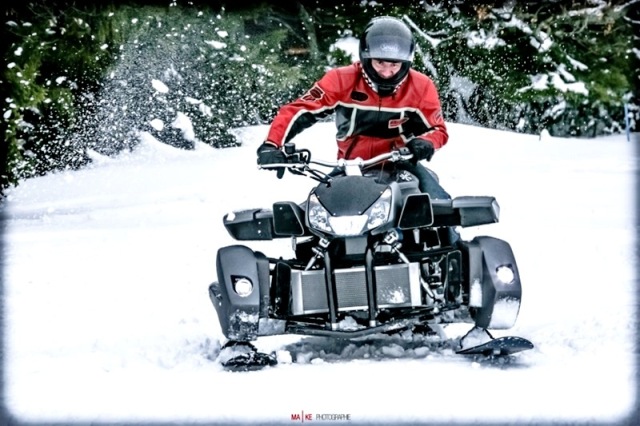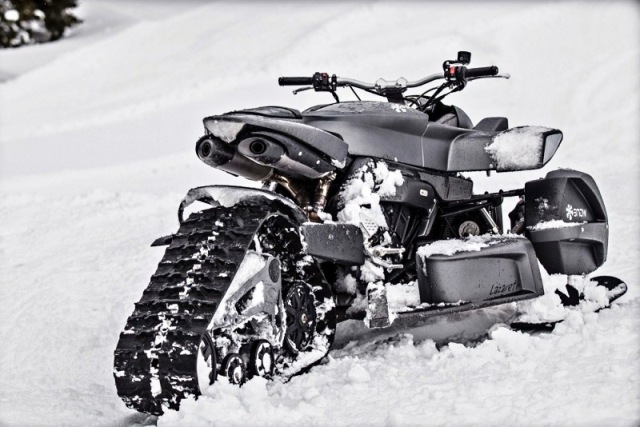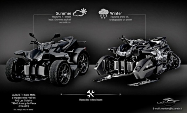 Είναι ασυνήθιστο, αλλά θυμίζει και κάτι… Όχι, δεν είναι το snowmobile του sequel Robocop, αλλά η χειμερινή, τρίποδη μετάλλαξη του μοναδικού Wazuma, του ακραίου quad (τετράτροχο) που είχε σχεδιάσει και κατασκευάσει γύρω από έναν κινητήρα R1 ο ιδιοφυής γάλλος βελτιωτής/σχεδιαστής Ludovic Lazareth.