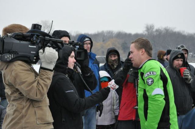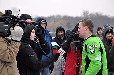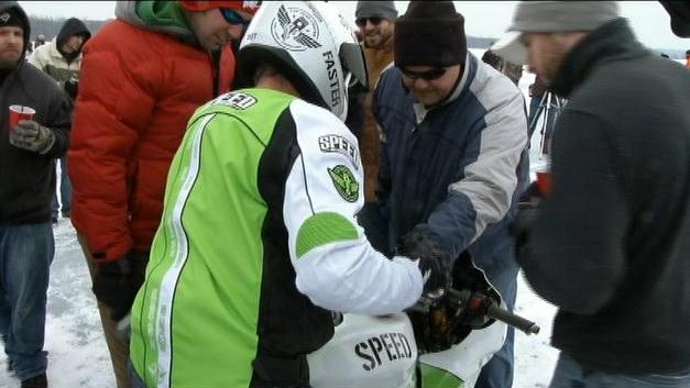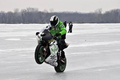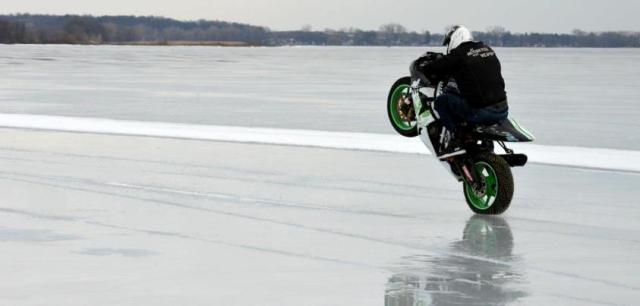 Μετά τη σούζα των 320 χιλιομέτρων την ώρα -σε στέρεο έδαφος- θα έλεγε κανείς ότι το θέμα έχει κλείσει. Όμως όταν συναντώνται η τρέλα με τη φαντασία, τα πράγματα γίνονται ακόμη πιο «τρομακτικά». Ο Ryan Suchanek πριν ένα περίπου χρόνο είχε «εγκαινιάσει» το ρεκόρ ταχύτητας με τον ένα τροχό στον αέρα στον πάγο, αναπτύσσοντας ταχύτητα 95 μιλίων την ώρα – 152.89 χιλιομέτρων ανά ώρα. Το ρεκόρ καταγράφηκε στις 5 Φεβρουαρίου του 2011 στη λίμνη Koshkonong, στο Wisconsin των ΗΠΑ και πέρασε στο βιβλίο Γκίνες. Τότε, ο Ryan είχε χρησιμοποιήσει ένα Kawasaki ZX6R με τις απαραίτητες τροποποιήσεις για το εγχείρημα. Η κύρια μετατροπή ήταν η τοποθέτηση ελαστικού με καρφιά ώστε να υπάρχει η στοιχειώδης πρόσφυση στον πάγο και ένα πιο ισχυρό αμορτισέρ τιμονιού για την κρίσιμη στιγμή της προσγείωσης του εμπρός τροχού στον πάγο. Πριν λίγες ημέρες ο Ryan Suchanek ένιωσε ότι ήταν έτοιμος να αναβαθμίσει το ρεκόρ του, ακόμη κι αν δεν είχε βρεθεί κανείς να το απειλήσει. Απλά ήθελε να ανεβάσει τον πήχυ πιο ψηλά και να καταγραφεί εκ νέου στο βιβλίο Γκίνες των ρεκόρ. Αυτή τη φορά η μοτοσυκλέτα του ήταν ένα Kawasaki ZX10 και το πράγμα είχε συνολικά οργανωθεί καλύτερα. Πλήθος κόσμου είχε προσκληθεί ώστε να πιστοποιηθεί το κατόρθωμα, μιας και αυτό αποτελεί προϋπόθεση για την καταγραφή ενός ρεκόρ στο βιβλίο Γκίνες χωρίς την παρουσία των υπευθύνων του βιβλίου. Ο στίβος ήταν και πάλι η λίμνη Koshkonong και αυτή τη φορά η ταχύτητα που κατάφερε να αναπτύξει ήταν 108,5 μιλίων, περίπου 174,6 χιλιομέτρων την ώρα. Ο Suchanek είχε να αντιμετωπίσει και ισχυρούς πλευρικούς ανέμους, που μετακινούσαν νέφη από χιόνι ενώ σύντομα άρχισε να πέφτει και νέο χιονόνερο. Έτσι ενώ η τελική προσπάθεια είχε προγραμματιστεί για το απόγευμα, το χρονοδιάγραμμα συμπιέστηκε και η τελική προσπάθεια έγινε το μεσημέρι. Η ταχύτητα καταγράφηκε από δύο συσκευές GPS και ένα ραντάρ ταχύτητας. Για να καταγραφεί ένα ρεκόρ στο «Guinness Book of World Records», πρέπει συσκευές να αποδείξουν την ταχύτητα αλλά και μάρτυρες να είναι παρόντες ώστε να επιβεβαιώσουν ότι όντως συνέβησαν. Ο Suchanek είχε φροντίσει για όλα αυτά και ασφαλώς την κάλυψη από τα ΜΜΕ. Κώνοι είχαν τοποθετηθεί ώστε να σηματοδοτηθεί η αρχή της περιοχής όπου άρχιζε η μέτρηση, άρα έπρεπε να ξεκινήσει τη σούζα. Το θέμα είναι ότι η σούζα έπρεπε να διαρκέσει τουλάχιστον για μια απόσταση 200 μέτρων ώστε να «ισχύει» το ρεκόρ. Προσπάθεια να σπάσει το παλιό ρεκόρ του Suchanek έκανε και ο Joe Beavers, ένας ακόμη κασκαντέρ. Όμως δεν κατάφερε να βρει αρκετή πρόσφυση ώστε να νιώσει ασφαλής και παραιτήθηκε από την προσπάθεια. «Προσπάθησε, όμως το ελαστικό του δεν ήταν τόσο καλά προετοιμασμένο όσο το δικό μου και επίσης δεν είχε τόση ευκολία στο να σηκώσει τον τροχό με αυτή την ταχύτητα. Αν και πιστεύω ότι αυτό που πραγματικά έφταιγε ήταν ότι φοβήθηκε να πιέσει περισσότερο», είπε λίγο καυστικά ο Ryan. «Ο αέρας δεν βοήθησε στο εγχείρημα. Η μετεωρολογική υπηρεσία έδινε περισσότερο αέρα με ριπές από τα νοτιοανατολικά για την ώρα που είχα σχεδιάσει να κάνω την προσπάθεια για το ρεκόρ». «Με τόσο αέρα ήταν ήδη χάλια», δήλωσε μετά το εγχείρημα. «Ερχόταν από το πλάι και ήταν περίεργο γιατί σε πήγαινε κόντρα στην κατεύθυνσή του, δεν σε παρέσυρε από την άλλη όπως περίμενα ότι θα συμβεί. Πάλευα όλη μέρα με αυτό το θέμα». Παρά τον καιρό πάντως, ο Suchanek είπε ότι το να σπάσει το δικό του ρεκόρ ήταν πιο εύκολο απ’ όσο πιθανά φαινόταν στον κόσμο που είχε πάει να τον παρακολο