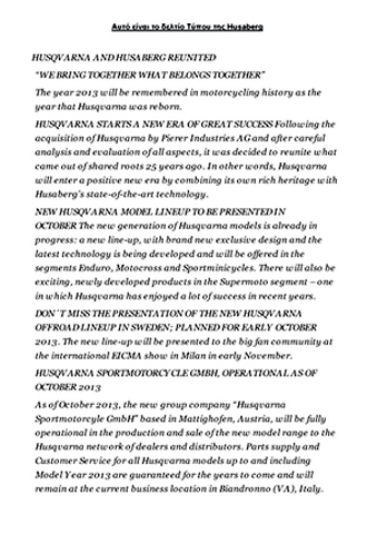 Δεν υπάρχει επίσημη αναφορά για το τέλος του ονόματος Husaberg ως ξεχωριστή μάρκα, ωστόσο κάτι τέτοιο υπονοείται από τις κινήσεις της εταιρείας και τις διατυπώσεις στο σχετικό δελτίο Τύπου. Το επισυνάπτουμε ώστε βγάλει καθένας τα δικά του συμπεράσματα.