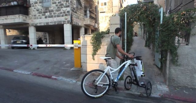 Όχι και η πιο ευκίνητη ή κομψή λύση. Η κατασκευή που δείχνουμε εδώ αποτελεί μια πιο αποδεκτή εναλλακτική πρόταση. Αποτελεί σύλληψη του ισραηλινού βιομηχανικού σχεδιαστή Ofir Yadan και ονομάζεται S-cargo. Η δίτροχη κατασκευή αντικαθιστά τον κανονικό μπροστινό τροχό του ποδηλάτου, μετατρέποντάς τον προσωρινά και για όσο χρειάζεται, σε τρίτροχο.