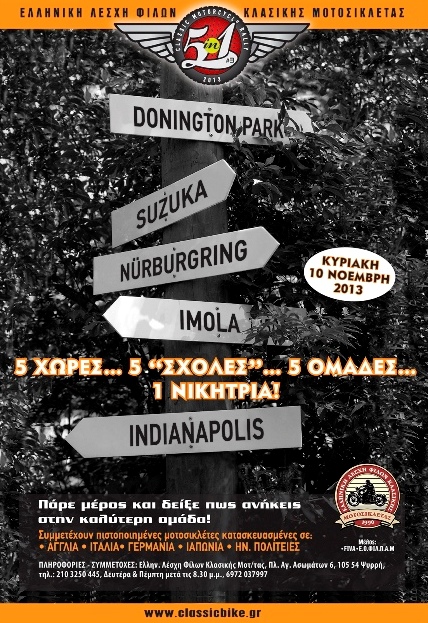 Η ελληνική λέσχη φίλων κλασσικής μοτοσυκλέτας διοργανώνει τον 3ο αγώνα «5 σε 1 Classic Rally» στις 10 Νοέμβρη 2013, μια καλή ευκαιρία όπως δηλώνει στο σχετικό δελτίο Τύπου, «να κλείσει αυτή η ανάποδη χρονιά με ένα χαμόγελο».