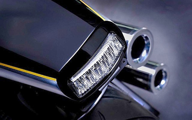 Από πιο κοντά όμως, μια βόλτα γύρω από τη μοτοσυκλέτα αποκαλύπτει την τελειότητα της ψευδαίσθησης. Ναι, το μακρύ κυλινδρικό ρεζερβουάρ από βουρτσισμένο αλουμίνιο παραμένει, αλλού όμως αναλαμβάνει απόλυτα η συγχρονη τεχνολογία.