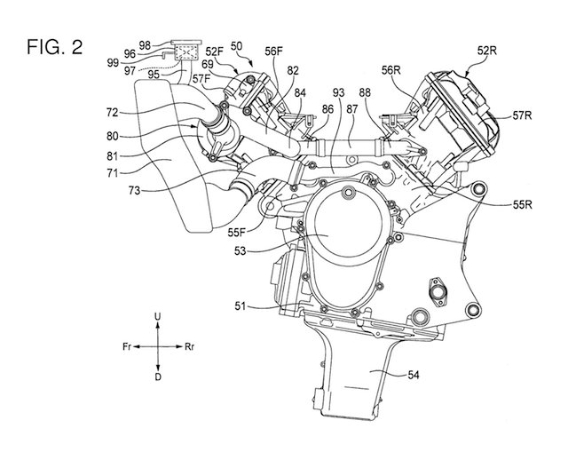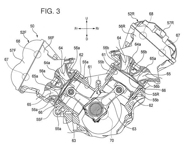 Η κυλινδροκεφαλή του μπροστινού ζεύγους κυλίνδρων είναι γυρισμένη προς τα πάνω, σχεδόν στις 45ο από την κάθετο, όπως και σε πολλές από τις σύγχρονες Ducati δρόμου.