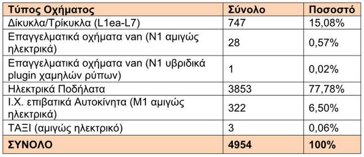 Η κατανομή του ενδιαφέροντος δείχνει ότι, την συντριπτική πλειοψηφία έχουν οι αιτήσεις για ηλεκτρικά ποδήλατα (77,78%), αυτά δηλαδή που αγοράζονται σε προσιτή τιμή για όλα τα βαλάντια.