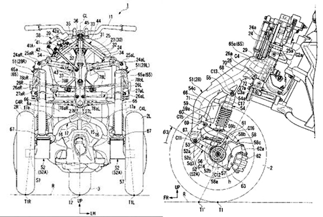 Τα μεγάλα νέα που μας δίνουν αυτά τα σχέδια έρχονται από το λαιμό και μπροστά όπου παρουσιάζεται η πρόταση της Honda για το πώς πρέπει να είναι ένα τρίτροχο όχημα που γέρνει. Η παραλληλόγραμμη άρθρωση που επιτρέπει στα τρίκυκλα να γέρνουν στις στροφές δίνει και εδώ το παρόν.