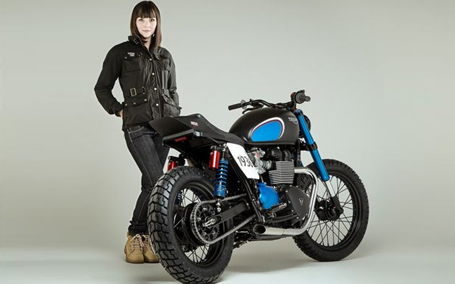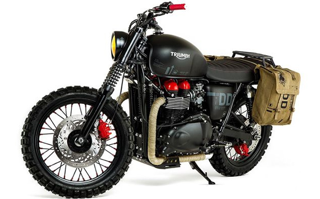 Στην περίπτωση αυτή η Bonnie έχει τροποποιηθεί εμφανισιακά σε ένα σκληροτράχηλο στρατιωτικό look με χωματερά λάστιχα Continental TKC80 και εξοπλισμό μου μοιάζει ρεαλιστικά αποτελεσματικός για περιπετειώδη χρήση.