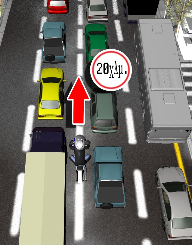 Όποιος λοιπόν κινείται έτσι, θα πρέπει για την ασφάλειά του να τηρεί αυστηρά τον κανόνα των +20 χλμ/ώρα. Προσοχή, δεν πρέπει να γίνει παρανόηση: δεν λέμε η ταχύτητά μας να μην ξεπερνά τα 20 χλμ/ω , αλλά αφορά τη σχετική μας ταχύτητα. Δηλαδή, το προσπέρασμα ή η κίνηση ανάμεσα στα αυτοκίνητα πρέπει να γίνεται με ταχύτητα μεγαλύτερη έως και +20 χλμ/ώρα από τη δική τους.