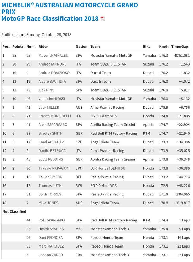 Άνετα πρώτος ο Βινιάλες έσπασε το αρνητικό σερί της Yamaha, με 2ο τον Ιανόνε και 3ο τον Ντοβιτσιόζο. Έπεσε ο Ζαρκό πάνω στον Μάρκεθ και εγκατέλειψαν και οι δύο. Εντυπωσιακός ο Μπαουτίστα τερμάτισε 4ος και στην 6η μόλις θέση ο Ρόσι… Ο αγώνας στην Αυστραλία ήταν πολύ ωραίος, με πολλές συγκινήσεις, μια τρομερά επικίνδυνη πτώση και έντονο συναγωνισμό. Με την εκκίνηση ο Μίλερ πετάχτηκε εμπρός και έστριψε πρώτος, ο Μάρκεθ μπερδεύτηκε και έχασε θέσεις και ο Βινιάλες από 2ος έπεσε 8ος! Ο Ρόσι διασώθηκε στην 5η θέση. Ωστόσο πριν καλά καλά τελειώσει ο πρώτος γύρος, ο Μάρκεθ βρέθηκε στη φυσική του θέση και άρχισε να απομακρύνεται. Ωστόσο η φύση της πίστας είναι τέτοια, που σε κάθε γύρο είχαμε και νέα σειρά στην πρώτη δεκάδα… Με ρυθμό που θύμιζε Moto3 οι θέσεις άλλαζαν με καταιγιστικό ρυθμό και ήταν δύσκολο να τις παρακολουθήσεις. Ο Μπαουτίστα έλαμπε και κάποια στιγμή έφτασε και δεύτερος. Ο Μάρκεθ δεν μπόρεσε να ξεφύγει και ο Ζαρκό έδειχνε πολύ επιθετικός περνώντας όποιον έβρισκε εμπρός του. Στην ευθεία οι εργοστασιακές Ducati έκαναν πολλές προσπεράσεις αλλά έχαναν θέσεις στην υπόλοιπη πίστα. Ο Ιανόνε έδειχνε δυνατός. Σε κάποιο σημείο ο Ζαρκό βρέθηκε πίσω από τον Μάρκεθ και αποφάσισε στο τέλος της ευθείας να προσπαθήσει να τον περάσει, έπιασε πολλά χιλιόμετρα, δεν υπολόγισε καλά και ακούμπησε κατά την διάρκεια του φρεναρίσματος από 322 χλιμ/ώρα τον πίσω τροχό του Μάρκεθ! Αυτό ήταν! Η μοτοσυκλέτα του έσπασε το υποπλαίσιο του Μάρκεθ και με 290 χλιμ/ώρα ο Ζαρκό βρέθηκε να ξύνει την άσφαλτο! Η πτώση ήταν τρομερή! Ευτυχώς ο Γάλλος δεν χτύπησε, ενώ ο Μάρκεθ με σπασμένο υποπλαίσιο αναγκάστηκε να εγκαταλείψει. Εμπρός οι μάχες συνεχίζονταν με τον Ρόσι να βρίσκεται για λίγο στην πρώτη θέση, τον Ντοβιτσιόζο να τον πιέζει και τον Μίλερ να χάνει συνεχώς θέσεις. Ο Βινιάλες όμως έδειχνε πολύ δυνατός. Ανέκαμψε από την 8η θέση, τους πέρασε διαδοχικά όλους, έφτασε πρώτος και άρχισε να απομακρύνεται. Ο Ιανόνε έδειχνε πως είχε την ταχύτητα να τον περάσει αλλά έκανε λάθη και έχανε θέσεις ενώ μετά τις ξανακέρδιζε. Στους τελευταίους γύρους ο Βινιάλες εξαφανίστηκε εμπρός και κατάφερε να κερδίσει θεωρητικά με μεγάλη άνεση. Ο Ιανόνε τερμάτισε 2ος αφού κατάφερε να περάσει τον Ντοβιτσιόζο που με την σειρά του είχε ξεπεράσει το εμπόδιο του Μπαουτίστα που έμεινε 4ος. Στον τελευταίο γύρο και ο Ρινς πέρασε τον Ρόσι που τελικά πήρε μόλις μια 6η θέση. Η τελική κατάταξη του αγώνα είναι:
