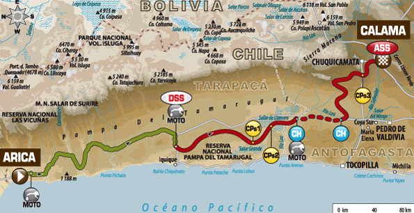 Η 6η αγωνιστική ημέρα θα τους οδηγήσει από την Arica στην Calama της Χιλής, μια διαδρομή 767 χιλιομέτρων εκ των οποίων τα 313 χλμ είναι απλή διαδρομή και τα 454 χλμ ειδική – η μεγαλύτερη μέχρι στιγμής.