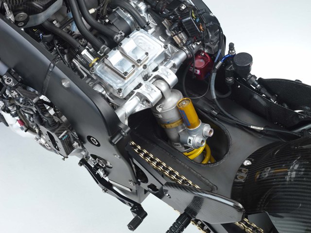Εδώ φαίνεται καθαρά η εξέλιξη στη σχεδιαστική φιλοσοφία της Yamaha, καθώς οι μοναχικοί βραχίονες που εκτείνονταν πλευρικά προς τα κάτω για να δέσουν τον κινητήρα, τώρα έχουν αντικατασταθεί με γεμάτα τρίγωνα, φανερά πιο στιβαρά.