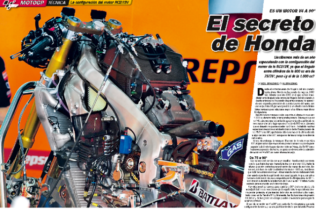 Ο Spalding κατάφερε να τραβήξει φωτογραφίες που αποδεικνύουν ότι η σημερινή μοτοσυκλέτα της Honda έχει περιεχόμενη γωνία V-90 μοιρών αντί 75ο που όλος ο κόσμος πίστευε ως τώρα. Το πότε έγινε αυτή η αλλαγή είναι ακόμη άγνωστο, όμως πιθανότατα ο κινητήρας αυτός ήταν ήδη στα χέρια του Casey Stoner, όταν κέρδισε το 2011 τον παγκόσμιο τίτλο. Δηλαδή η αλλαγή έγινε ταυτόχρονα με το μεγάλωμα του κινητήρα από τα 800 στα 1000 κυβικά.
