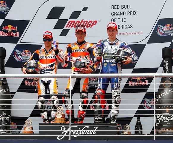 Τρίτος και πολύ μόνος τερμάτισε ο νικητής του Κατάρ Jorge Lorenzo που ήδη από το Σάββατο έδειχνε συμφιλιωμένος με την ιδέα ότι τα Honda είναι απλησίαστα και δεν μπορούσε να ελπίσει σε κάτι περισσότερο από την 3η θέση. Ισοβαθμεί πλέον στην κορυφή της βαθμολογίας, δίπλα στον πιτσιρικά, καθώς έχουν αμφότεροι από μία νίκη και μία τρίτη θέση.