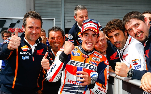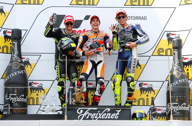Στο τέλος ο νεοφώτιστος Marquez κατάφερε να κρατηθεί μπροστά από τον επιτιθέμενο αν και πονεμένο Crutchlow και να κερδίσει το γερμανικό GP, επιστρέφοντας και στην κορυφή της βαθμολογίας! Ο «μικρός δαίμονας» είχε ηγηθεί ξανά στην κατάταξη μετά τον 2ο και τον 3ο αγώνα.