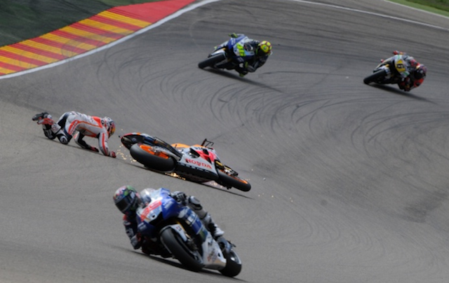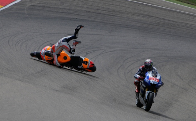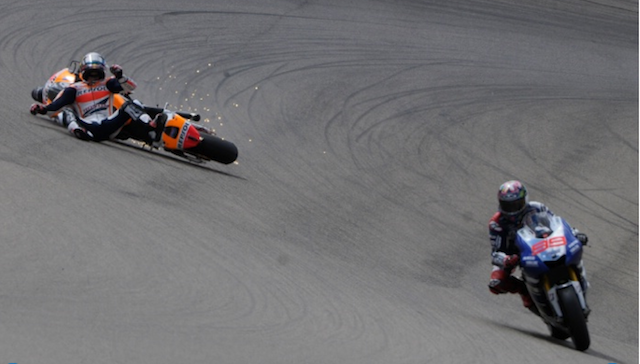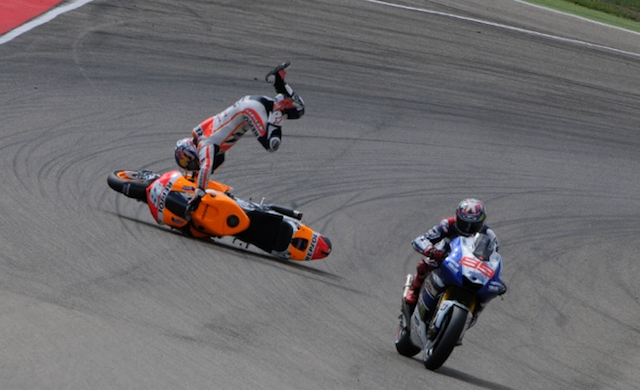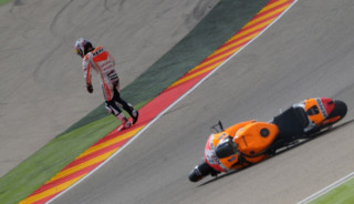 Θυμίζουμε ότι ο Marquez έχασε τα φρένα, χτύπησε στον πίσω τροχό του Pedrosa, αλλά δεν έπεσε, απλά βγήκε εκτός πίστας, έχασε κοντά δύο δευτερόλεπτα αλλά επέστρεψε και κέρδισε. Ο Dani αντίθετα όμως έπεσε λίγα μέτρα αργότερα από χάισαϊντ, καθώς στη σύγκρουση καταστράφηκε ο πίσω αισθητήρας και το σύστημα traction control της RCV του έπαψε να λειτουργεί σωστά.