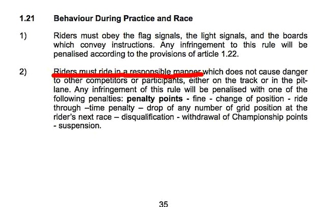 Η ποινή αποφασίστηκε με βάση το άρθρο 21.1, παράγραφος ΙΙ όπου αναφέρεται η υποχρέωση των πιλότων να «συμπεριφέρονται υπεύθυνα, ώστε να μην εκθέτουν σε κίνδυνο τους αντιπάλους τους στην πίστα ή την ευθεία των pit […] Κάθε παραβίαση τιμωρείται με έναν εκ των κάτωθι τρόπων: με βαθμούς ποινής, με ποινή διέλευσης από τα pit, με ποινή χρόνου, με απώλεια της θέσης εκκίνησης στον επόμενο αγώνα MotoGP, με ολική αποβολή και με αφαίρεση βαθμών στο πρωτάθλημα».