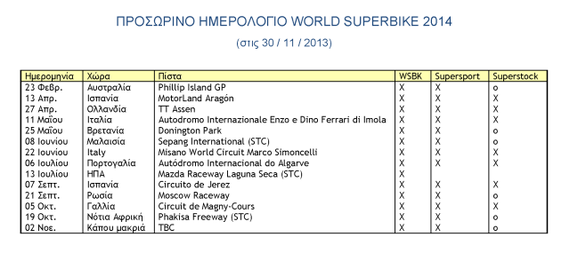Μετά από εκείνο των MotoGP, οι FIM και Dorna έδωσαν στη δημοσιότητα και το πρώτο, κατά τα συνήθη προσωρινό, αγωνιστικό ημερολόγιο του 2014 για το παγκόσμιο πρωτάθλημα Superbike. Κατά κανόνα τα Superbike βολεύονται στις «τρύπες» των ημερομηνιών που απομένουν, αφού πρώτα καθοριστούν οι σαιζόν της F1 και των MotoGP.