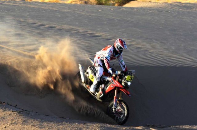 Ακόμη χειρότερα όμως ήταν τα πράγματα για τον εργοστασιακό της Honda, Paulo Goncalves που είδε την CRF 450 να τυλίγεται στις φλόγες και να γίνεται παρανάλωμα στη μέση της ερήμου, στο 113ο χιλιόμετρο της ειδικής.