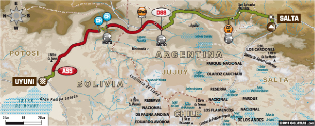 Η εκκίνηση της ειδικής στα 3.700 μέτρα υψόμετρο (!) καθυστέρησε καθώς η χαμηλή νέφωση δεν επέτρεπε στο ελικόπτερο υποστήριξης να πετάξει. Έτσι η διαδρομή κατά 100 χιλιόμετρα στα 300 στην μουσκεμένη από τη βροχή περιοχή της Salta, προς ανακούφιση των αναβατών που είχαν μια ακόμη «μαραθώνια» ειδική εμπρός τους.