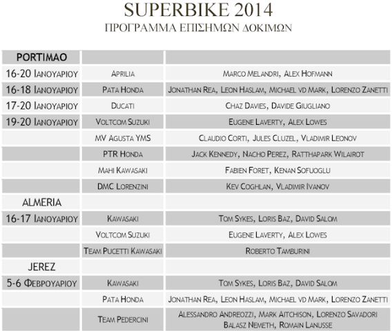 Επίσημο πρόγραμμα δοκιμών Superbike World Championship 2014