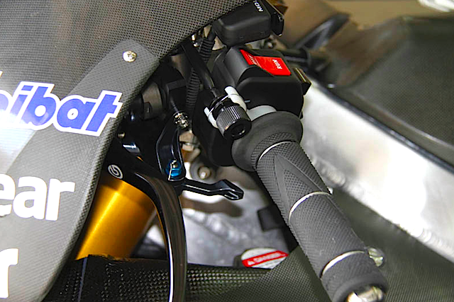 Στον κόκκινο κύκλο της φωτογραφίας φαίνεται η μικρομανέτα στο αριστερό γκριπ που επιτρέπει στους αναβάτες να βάζουν νεκρά. Πρόκειται για μια προφύλαξη ασφαλείας, παρόμοια με αυτήν που ήδη από τον προηγούμενο Σεπτέμβριο εμφανίστηκε στην Honda RC213V.