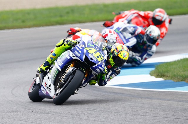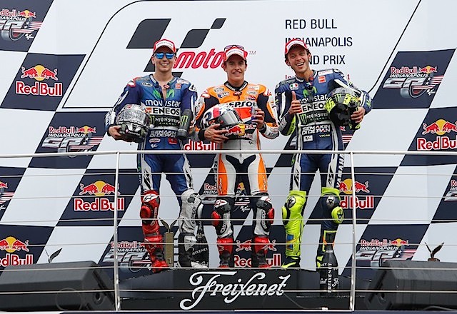 Τρίτος στο βάθρο πάλι ο Valentino Rossi που οδήγησε τον αγώνα για 11 γύρους, αλλά τερμάτισε 6,558 δευτ. πίσω από τον Marquez. Τέταρτος ο Dani Pedrosa που δεν ένιωσε ποτέ άνετα στην Ινδιανάπολη για να διεκδικήσει νίκη –και το ρίσκο να επιλέξει σκληρό μπροστινό λάστιχο δεν τού βγήκε τελικά.