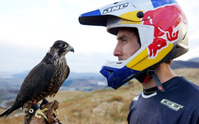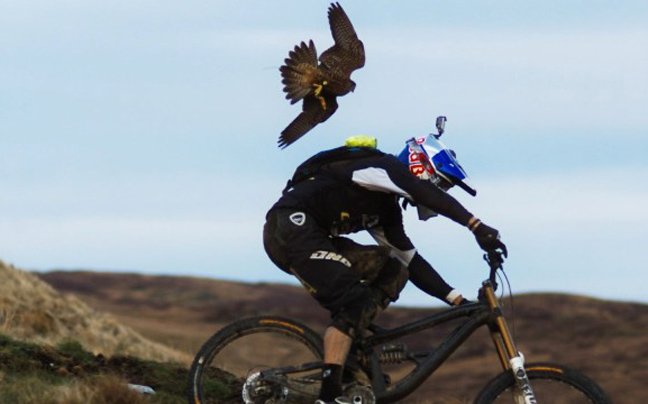 Ένας θρύλος του downhill και ένα γεράκι πετρίτης – Peregrine Falcon σε μια αγωνιώδη κατάβαση. Ο Gee Atherton, παγκόσμιος πρωταθλητής το 2010 στην ελεύθερη κατάβαση –downhill με mountain bike, προσπαθεί να κρατήσει στην πλάτη του το «δόλωμα» που το γεράκι έχει στοχεύσει.