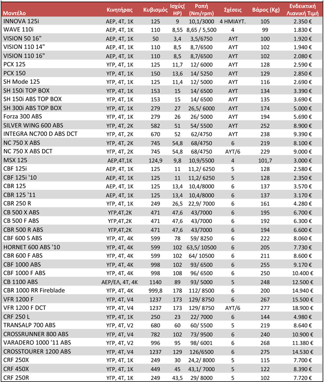 Νέο κατάλογο τιμών δημοσιοποίησε η Honda, όπου πέρα από τα νέα μοντέλα που είναι διαθέσιμα, περιλαμβάνονται και κάποιες μοτοσυκλέτες προηγούμενων ετών σε δελεαστικές τιμές.