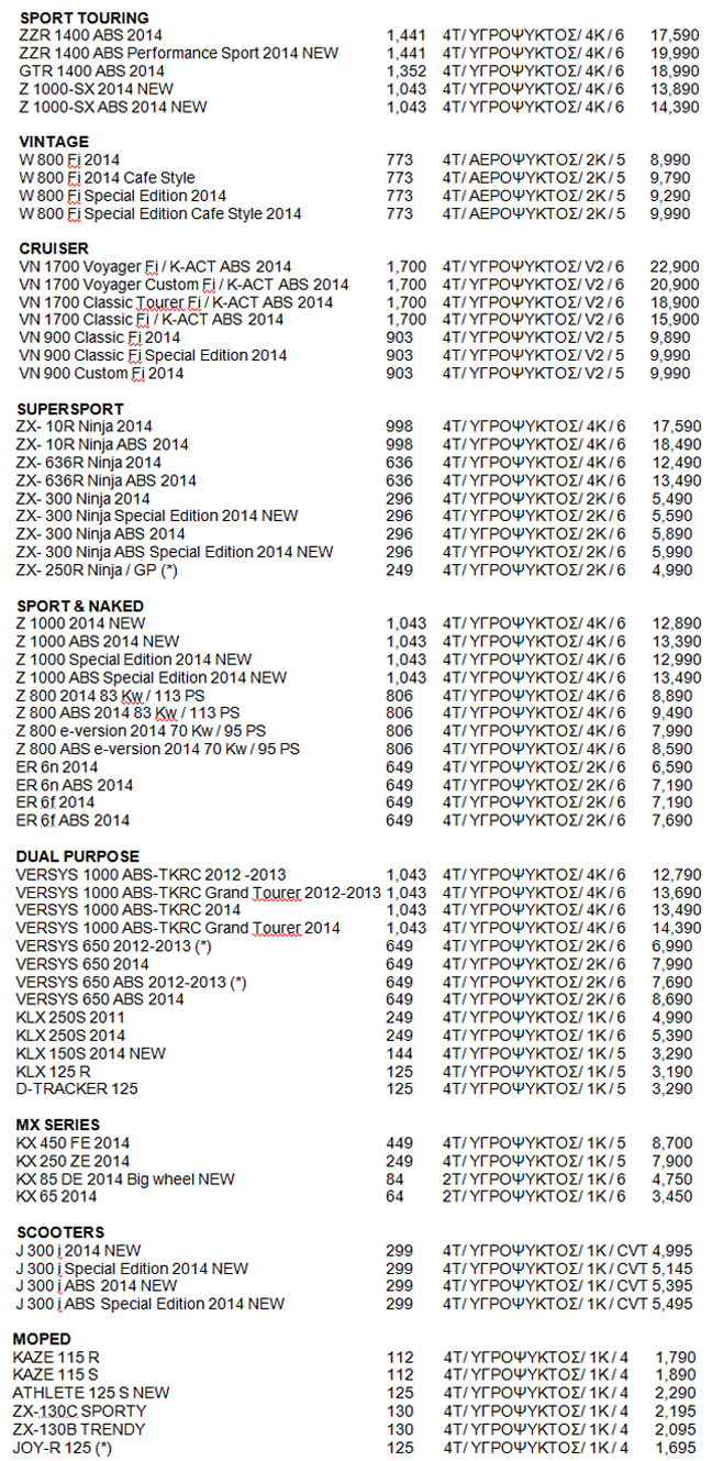 O νέος ανανεωμένος τιμοκατάλογος από την Kawasaki περιλαμβάνει και τα μοντέλα του 2014, το πρώτο scooter της εταιρείας, J300 και βέβαια το νέο εντυπωσιακό Ζ-1000