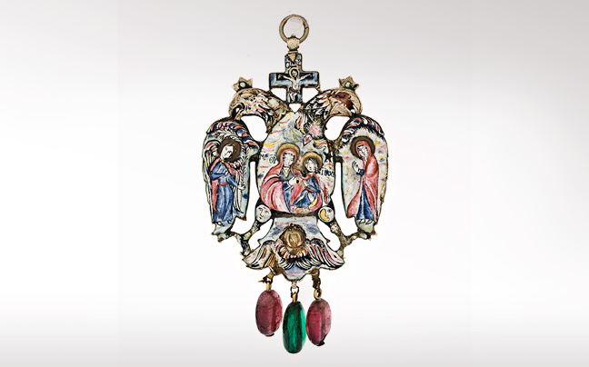 Χρυσό ιερατικό εγκόλπιο σε σχήμα δικέφαλου αετού με πολύτιμες πέτρες και σμαλτωμένες παραστάσεις της Παναγίας Βρεφοκρατούσας και του Ευαγγελισμού. Κωνσταντινούπολη, Β’ μισό του 17ου αιώνα