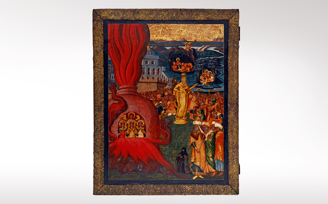 Εικόνα των Τριών Παίδων και του Προφήτη Δανιήλ με την υπογραφή του ζωγράφου Κωνσταντίνου Αδριανουπολίτη.