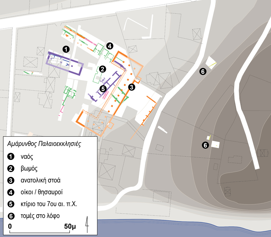 Σημαντικά είναι τα ευρήματα από το εσωτερικό του υστεροαρχαϊκού ναού της Αμαρυσίας Αρτέμιδος στην Αμάρυνθο, όπου συνεχίζονται και φέτος οι ελληνο-ελβετικές ανασκαφές.