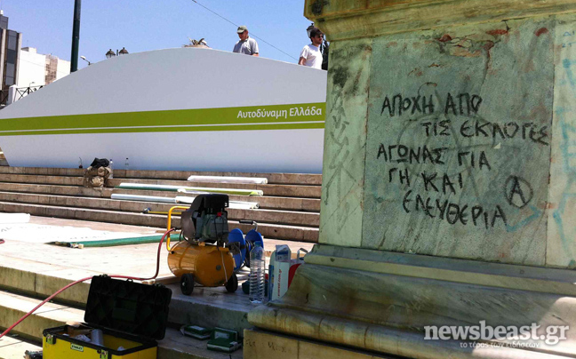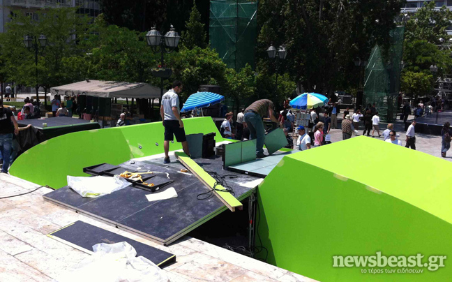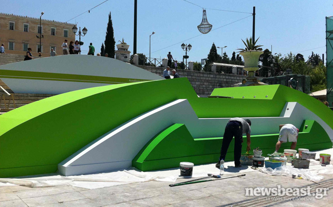 Στο σημείο έχουν στηθεί «πύργοι» όπου θα τοποθετηθούν φωτιστικά και κάμερες ενώ κάτω από την εξέδρα όπου θα εμφανιστεί ο Ευάγγελος Βενιζέλος θα υπάρχει ειδικό φωτιζόμενο πάτωμα.