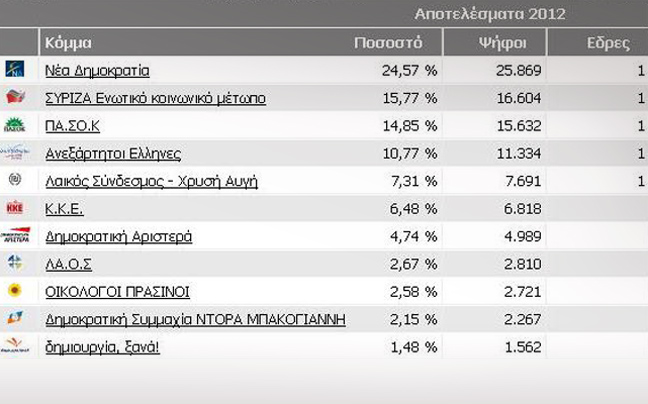 Με καταγεγραμμένο το 100% των εκλογικών κέντρων στη Φθιώτιδα η ΝΔ έρχεται πρώτο κόμμα με 24,57% και εκλέγει ένα βουλευτή. Δεύτερο κόμμα είναι ο ΣΥΡΙΖΑ με 15,71% και εκλέγει και αυτό ένα βουλευτή. Από ένα βουλευτή εκλέγουν ΠΑΣΟΚ, Ανεξάρτητοι Έλληνες και Χρυσή Αυγή.