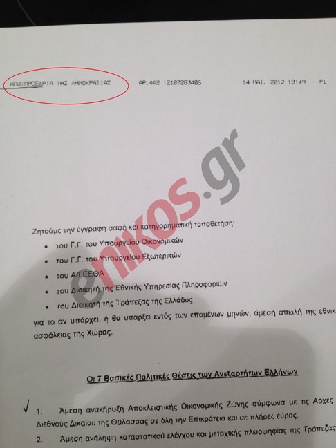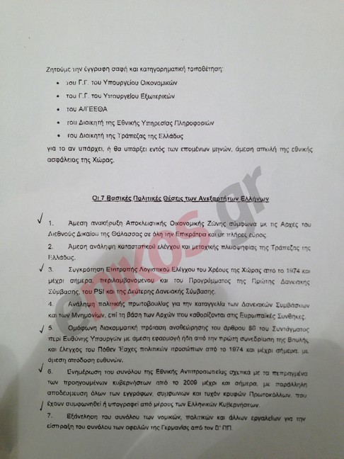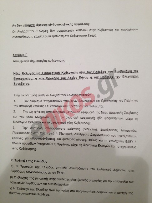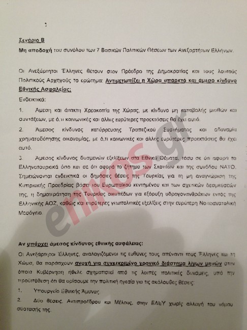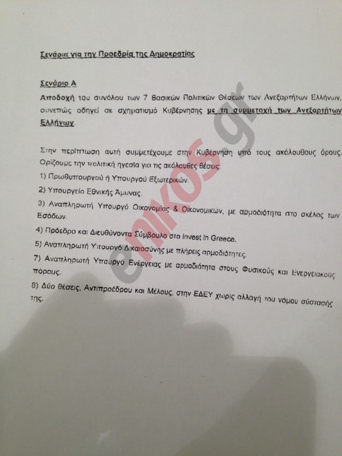 Όπως είπε ο κ.Καμμένος το μόνο που κατέθεσε στην προεδρία είναι οι θέσεις του κόμματος του και προφορικά μόνο εξέθεσε τους 7 όρους που θέτει και στους οποίους δεν περιλαμβάνεται σενάριο για κυβέρνηση υπό συνθήκες εκτάκτου ανάγκης.