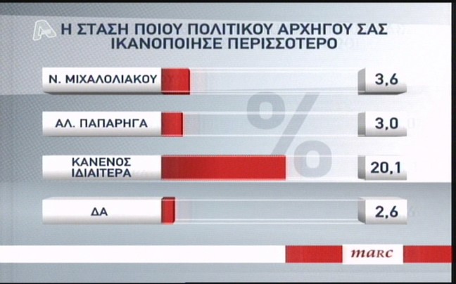 Στην ερώτηση «ποιος πολιτικός αρχηγός σας ικανοποίησε περισσότερο» τη δεύτερη θέση παίρνει ο Αντώνης Σαμαράς με 18,6%, την τρίτη ο Ευ. Βενιζέλος με 13,6%, με 11,9% ο Φώτης Κουβέλης ακολουθεί ο, μετά ο Πάνος Καμμένος με 6,4%, ο Νίκος Μιχαλολιάκος με 3,6%, η Αλέκα Παπαρήγα με 3% και «κανένας» 20,1%.