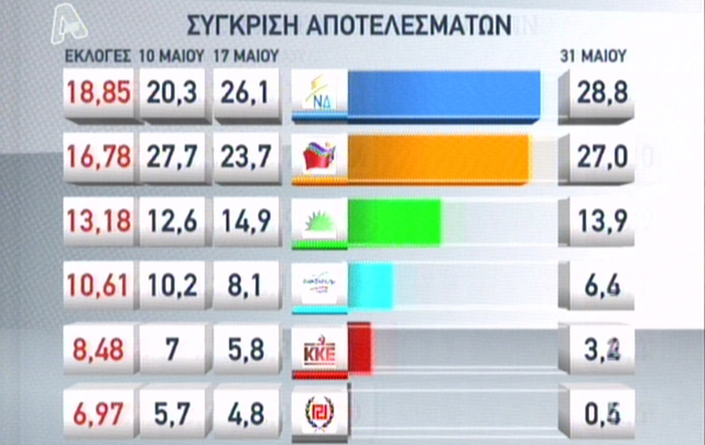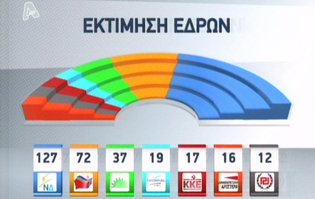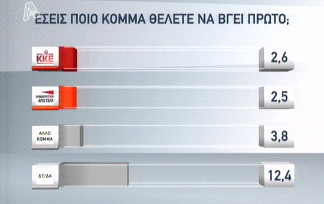 Με αναγωγή, πάντως, της αδιευκρίνιστης ψήφου (αναποφάσιστοι, άκυρα και λευκά), η εταιρία εκτιμά ότι η δύναμη των κομμάτων θα διαμορφωθεί ως εξής (σε παρένθεση οι έδρες που υπολογίζεται ότι θα καταλάβουν): ΝΔ 28,8% (127 έδρες), ΣΥΡΙΖΑ 27% (72 έδρες), ΠΑΣΟΚ 13,9% (37 έδρες), Ανεξάρτητοι Έλληνες 7% (19 έδρες), ΚΚΕ 6,3% (17 έδρες), ΔΗΜΑΡ 5,9% (16 έδρες), Χρυσή Αυγή 4,6% (12 έδρες), Δημιουργία Ξανά 2,5%, Οικολόγοι πράσινοι 1,1% και ΛΑΟΣ 1,1%.