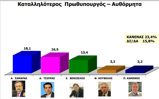 Πρώτη σε πρόθεση ψήφου με ποσοστό 23,9% είναι η ΝΔ σύμφωνα με νέα δημοσκόπηση της MRB που διενεργήθηκε για το Real.gr. Σε «απόσταση αναπνοής» ακολουθεί ο ΣΥΡΙΖΑ με 22,5%. Τρίτο κόμμα, εμφανίζεται το ΠΑΣΟΚ με 12,6% και την 7αδα των κομμάτων που εξασφαλίζουν την είσοδο τους στη Βουλή συμπληρώνουν, οι Ανεξάρτητοι Έλληνες με ποσοστό 6,2%, η Δημοκρατική Αριστερά με 5,7%, η Χρυσή Αυγή με 4,7% και το ΚΚΕ με 4%.