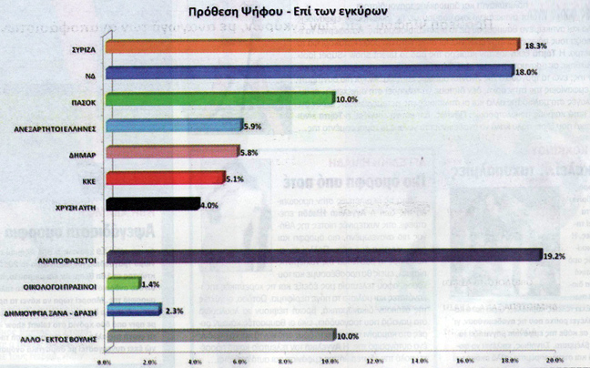 Στην πρόθεση ψήφου πρώτη εκλογική δύναμη αναδεικνύεται ο ΣΥΡΙΖΑ με ποσοστό 18,3%, δεύτερη, με οριακή διαφορά η Νέα Δημοκρατία με 18% και Τρίτη δύναμη το ΠΑΣΟΚ με 10%. Ακολουθούν Ανεξάρτητοι Έλληνες με 5,9%, ΔΗΜΑΡ με 5,8%, ΚΚΕ με 5,1% και Χρυσή Αυγή με 4%. Εκτός Βουλής μένει, σύμφωνα με τη δημοσκόπηση, ο Στέφανος Μάνος, με 2,3%.