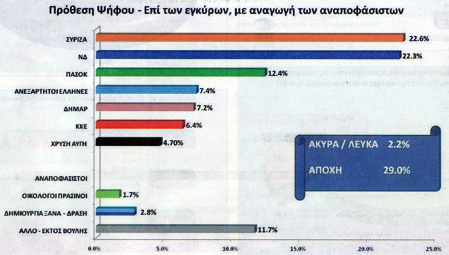 Με αναγωγή επί των εγκύρων και των αναποφάσιστων ο ΣΥΡΙΖΑ προηγείται με 22,6% και ακολουθεί η Νέα Δημοκρατία με 22,3%, το ΠΑΣΟΚ με 12,4%, οι Ανεξάρτητοι Έλληνες με 7,4%, η ΔΗΜΑΡ με 7,2%, το ΚΚΕ με 6,4% και η Χρυσή Αυγή με 4,7%.