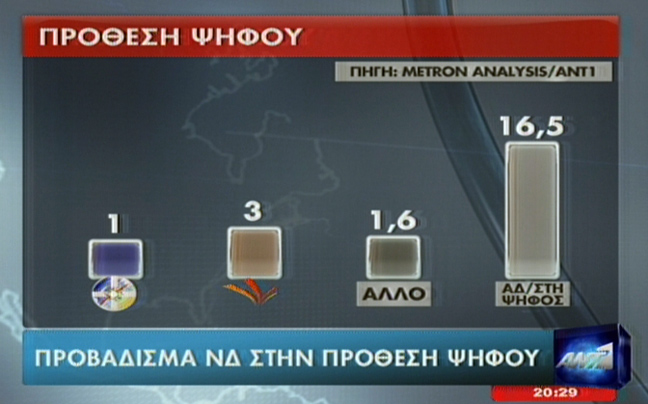 Νέα δημοσκόπηση της Metron Analysis για τον ΑΝΤ1 δίνει οριακό προβάδισμα στην πρόθεση ψήφου με 0,7 της μονάδας στη Νέα Δημοκρατία.