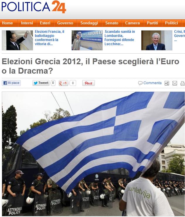 Όπως αναφέρει η ιστοσελίδα Politica 24 της Ιταλίας σε άρθρο της με τίτλο «Η Ελλάδα θα διαλέξει το ευρώ ή τη δραχμή»; από τα αποτελέσματα των εκλογών εξαρτάται και η πορεία της χώρας στην Ε.Ε. και στην ευρωζώνη.