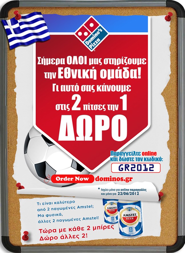 Σήμερα όλοι μας στηρίζουμε την Εθνική Ομάδα! Για αυτό και η Domino’s Pizza σάς κάνει στις δύο πίτσες την μία ΔΩΡΟ!