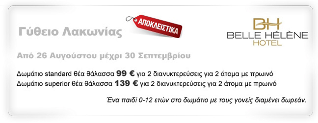 Ανέμελες στιγμές χαλάρωσης και ξεκούρασης σας υπόσχεται το ξενοδοχείο Belle Helene, που βρίσκεται μέσα σε έναν υπέροχο ελαιώνα, λίγα χιλιόμετρα έξω από την πόλη του Γυθείου. Ο μικρός αυτός επίγειος παράδεισος, είναι ιδανικός για χαλαρωτικές διακοπές, όλο το χρόνο.