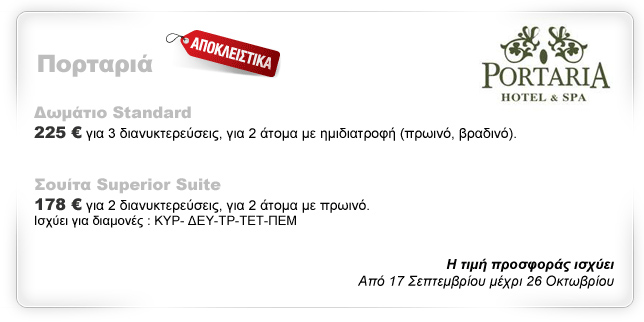 Τη μαγεία του φθινοπώρου, στο μαγικό βουνό των Κενταύρων, στην αρχοντική Πορταριά σάς καλεί να ζήσετε το ξενοδοχείο Portaria Hotel & Spa, προσφέροντας σας μια εξαιρετική τιμή.