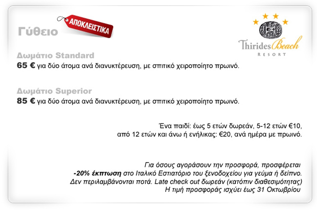 Στο κατώφλι της Μάνης, το όμορφο Γύθειο, το Thirides Beach Resort σας προσκαλεί να υποδεχθείτε το Φθινόπωρο, με θέα το απέραντο γαλάζιο! Με μια μοναδική προσφορά το ξενοδοχείο σας υπόσχεται αξέχαστες στιγμές διακοπών.