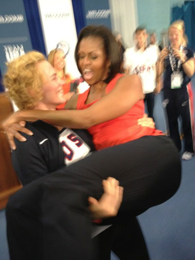 Στην αγκαλιά μια αθλήτριας βρέθηκε η Μισέλ Ομπάμα. Η Αμερικανίδα παλαιστής, Ελένα Πιρόζνκοβα, την σήκωσε στην αγκαλιά της και, όπως ήταν φυσικό, μια συναθλήτριά της αποτύπωσε το γεγονός στην φωτογραφική της μηχανή και το «ανέβασε» στο twitter!